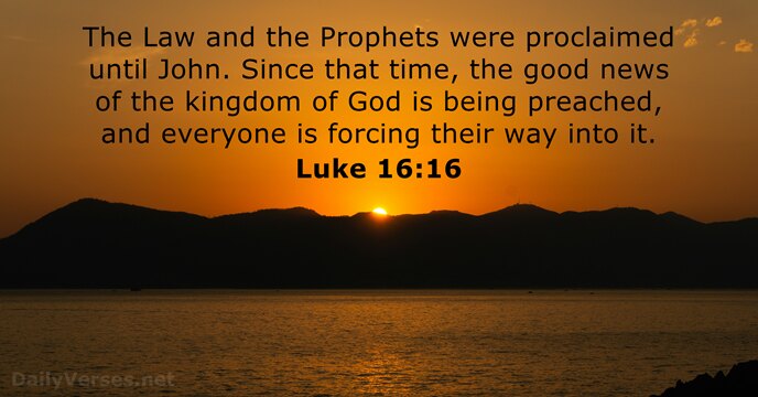 The Law and the Prophets were proclaimed until John came; since that time the gospel of the kingdom of God has been preached, and everyone is forcing his way into it.