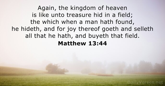 The kingdom of heaven is like a treasure hidden in the field, which a man found and hid again; and from joy over it he goes and sells everything that he has, and buys that field.