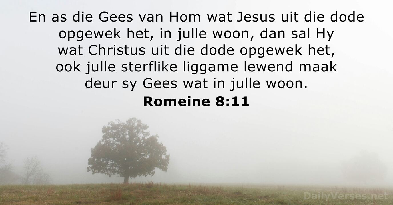 En as die Gees van Hom wat Jesus uit die dode opgewek het, in julle woon, dan sal Hy wat Christus uit die dode opgewek het, ook julle sterflike liggame lewend maak deur sy Gees wat in julle woon.
