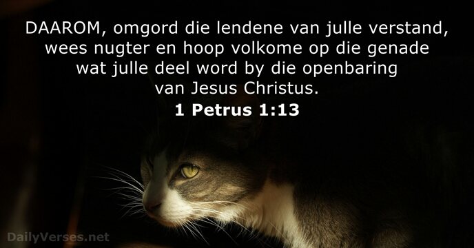 DAAROM, omgord die lendene van julle verstand, wees nugter en hoop volkome op die genade wat julle deel word by die openbaring van Jesus Christus.