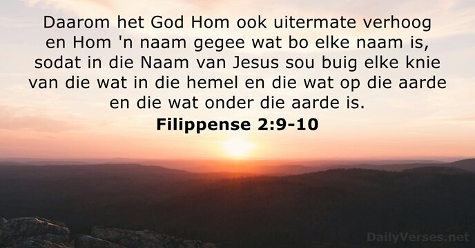 Daarom het God Hom ook uitermate verhoog en Hom 'n naam gegee wat bo elke naam is, sodat in die Naam van Jesus sou buig elke knie van die wat in die hemel en die wat op die aarde en die wat onder die aarde is.