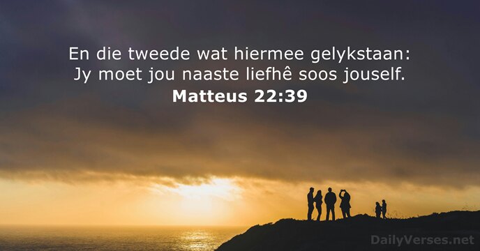 En die tweede wat hiermee gelykstaan: Jy moet jou naaste liefhê soos jouself.