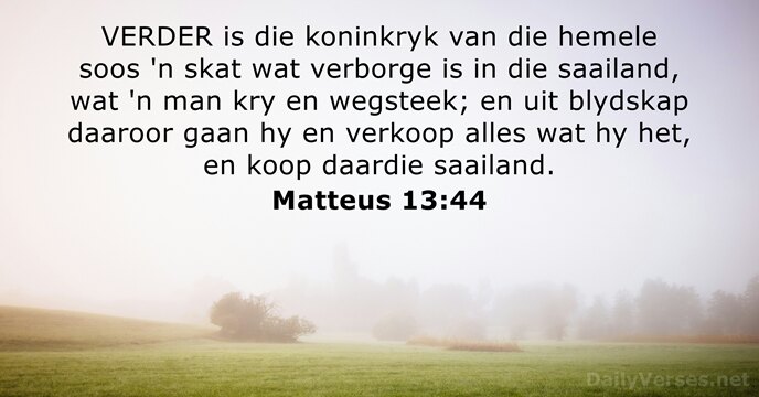 VERDER is die koninkryk van die hemele soos 'n skat wat verborge is in die saailand, wat 'n man kry en wegsteek; en uit blydskap daaroor gaan hy en verkoop alles wat hy het, en koop daardie saailand.