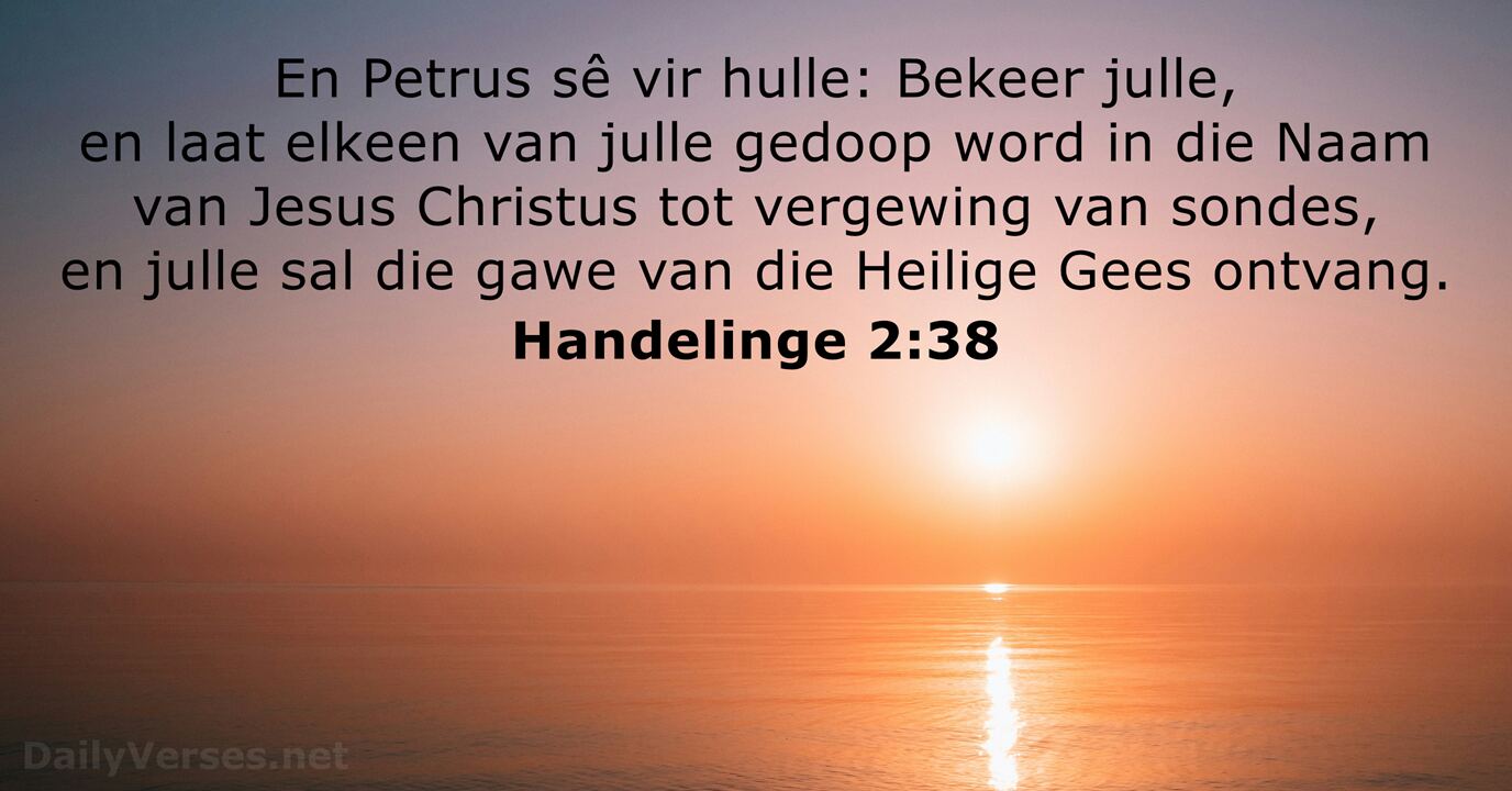 En Petrus sê vir hulle: Bekeer julle, en laat elkeen van julle gedoop word in die Naam van Jesus Christus tot vergewing van sondes, en julle sal die gawe van die Heilige Gees ontvang.