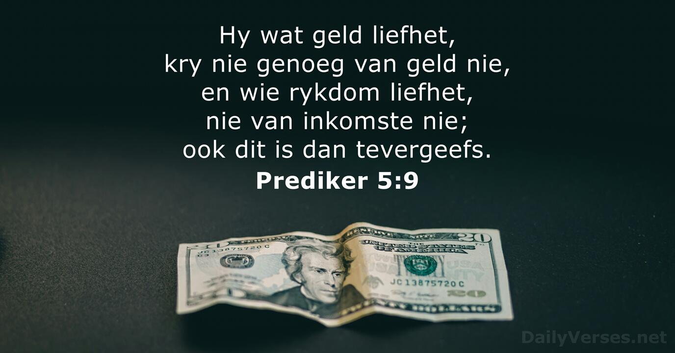 Hy wat geld liefhet, kry nie genoeg van geld nie, en wie rykdom liefhet, nie van inkomste nie; ook dit is dan tevergeefs.