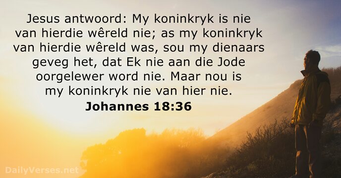 Jesus antwoord: My koninkryk is nie van hierdie wêreld nie; as my koninkryk van hierdie wêreld was, sou my dienaars geveg het, dat Ek nie aan die Jode oorgelewer word nie. Maar nou is my koninkryk nie van hier nie.