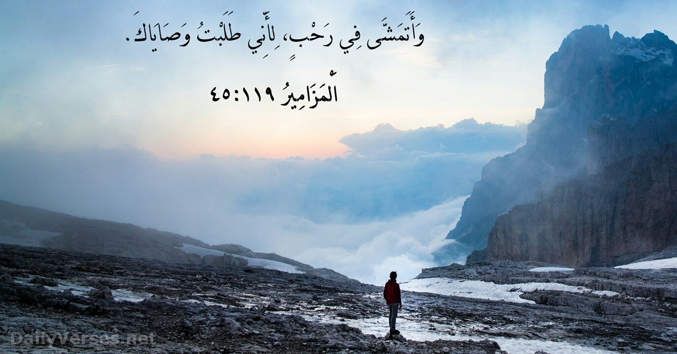 وَأَسْلُكَ فِي رَحَابَةِ الْحُرِّيَّةِ، لأَنِّي الْتَمَسْتُ أَوَامِرَكَ. إِذًا إِنْ كَانَ أَحَدٌ فِي ٱلْمَسِيحِ فَهُوَ خَلِيقَةٌ جَدِيدَةٌ: ٱلْأَشْيَاءُ ٱلْعَتِيقَةُ قَدْ مَضَتْ، هُوَذَا ٱلْكُلُّ قَدْ صَارَ جَدِيدًا. تَعَالَوْا إِلَيَّ يا جَمِيعَ ٱلْمُتْعَبِينَ وَٱلثَّقِيلِي ٱلْأَحْمَالِ، وَأَنَا أُرِيحُكُمْ.الاية التالية!مع الصورة