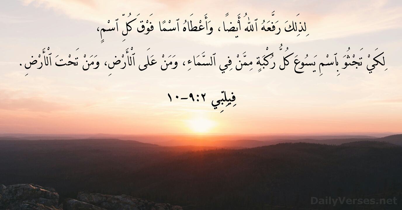 لِذَلِكَ أَيْضاً رَفَّعَهُ اللهُ عَالِياً، وَأَعْطَاهُ الاِسْمَ الَّذِي يَفُوقُ كُلَّ اسْمٍ، لِكَيْ تَنْحَنِيَ سُجُوداً لاِسْمِ يَسُوعَ كُلُّ رُكْبَةٍ، سَوَاءٌ فِي السَّمَاءِ أَمْ عَلَى الأَرْضِ أَمْ تَحْتَ الأَرْضِ.