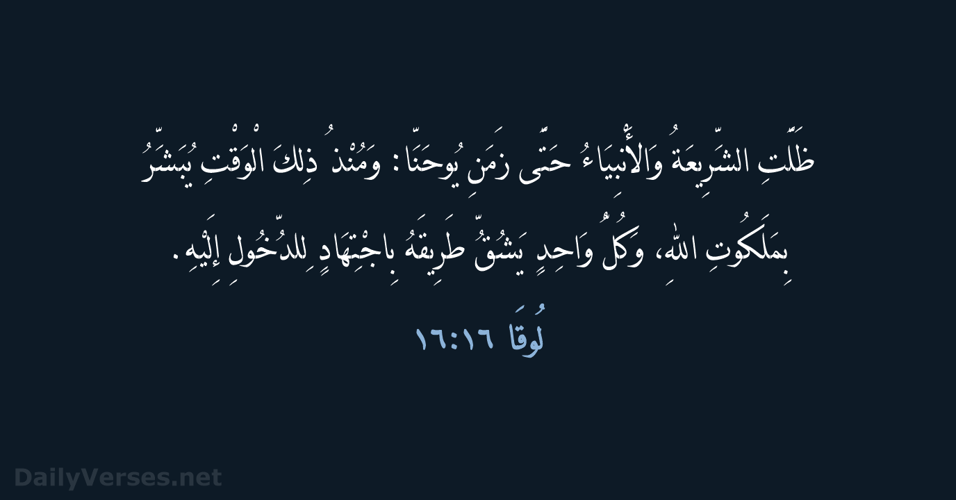 كَانَ ٱلنَّامُوسُ وَٱلْأَنْبِيَاءُ إِلَى يُوحَنَّا. وَمِنْ ذَلِكَ ٱلْوَقْتِ يُبَشَّرُ بِمَلَكُوتِ ٱللهِ، وَكُلُّ وَاحِدٍ يَغْتَصِبُ نَفْسَهُ إِلَيْهِ.