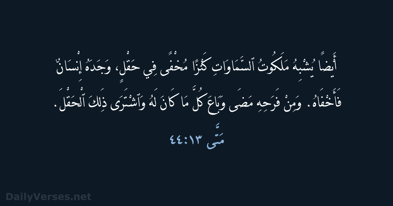 أَيْضًا يُشْبِهُ مَلَكُوتُ ٱلسَّمَاوَاتِ كَنْزًا مُخْفًى فِي حَقْلٍ، وَجَدَهُ إِنْسَانٌ فَأَخْفَاهُ. وَمِنْ فَرَحِهِ مَضَى وَبَاعَ كُلَّ مَا كَانَ لَهُ وَٱشْتَرَى ذَلِكَ ٱلْحَقْلَ.