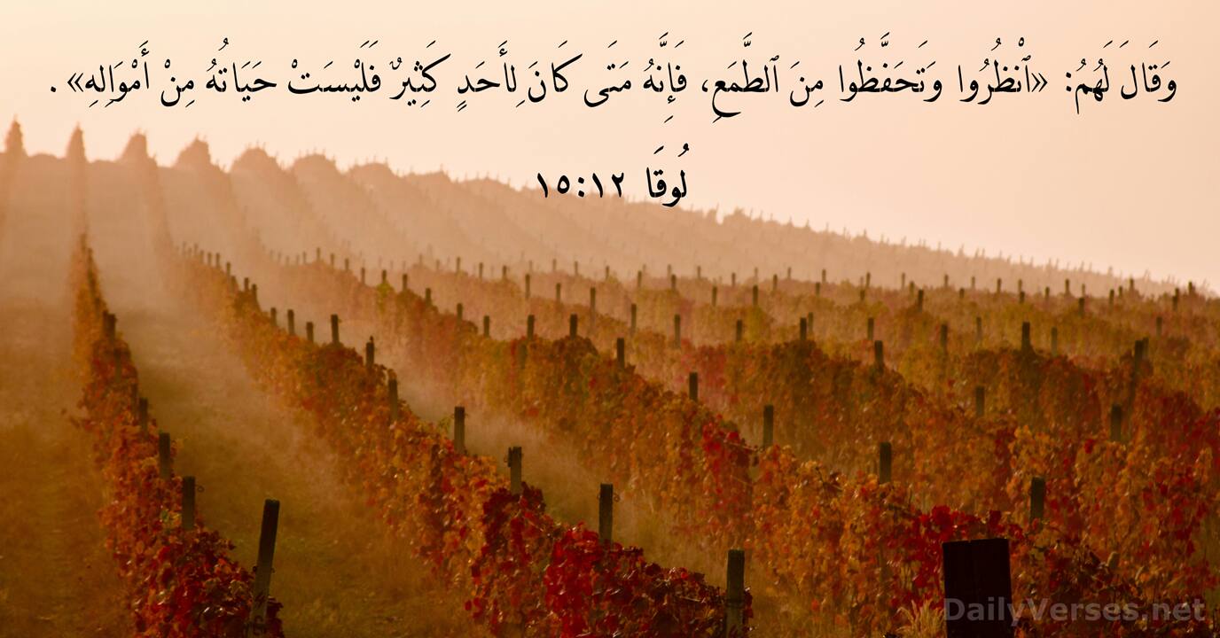 وَقَالَ لَهُمُ: «ٱنْظُرُوا وَتَحَفَّظُوا مِنَ ٱلطَّمَعِ، فَإِنَّهُ مَتَى كَانَ لِأَحَدٍ كَثِيرٌ فَلَيْسَتْ حَيَاتُهُ مِنْ أَمْوَالِهِ».