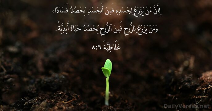 فَإِنَّ مَنْ يَزْرَعُ لِجَسَدِهِ، فَمِنَ الْجَسَدِ يَحْصُدُ فَسَاداً. وَمَنْ يَزْرَعُ لِلرُّوحِ، فَمِنَ الرُّوحِ يَحْصُدُ حَيَاةً أَبَدِيَّةً. فَلا نَفْشَلْ فِي عَمَلِ الْخَيْرِ.