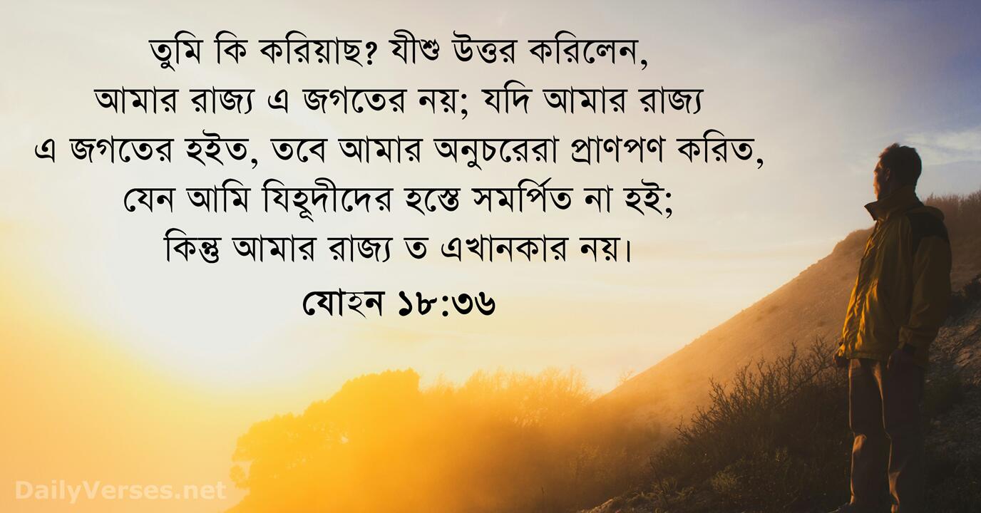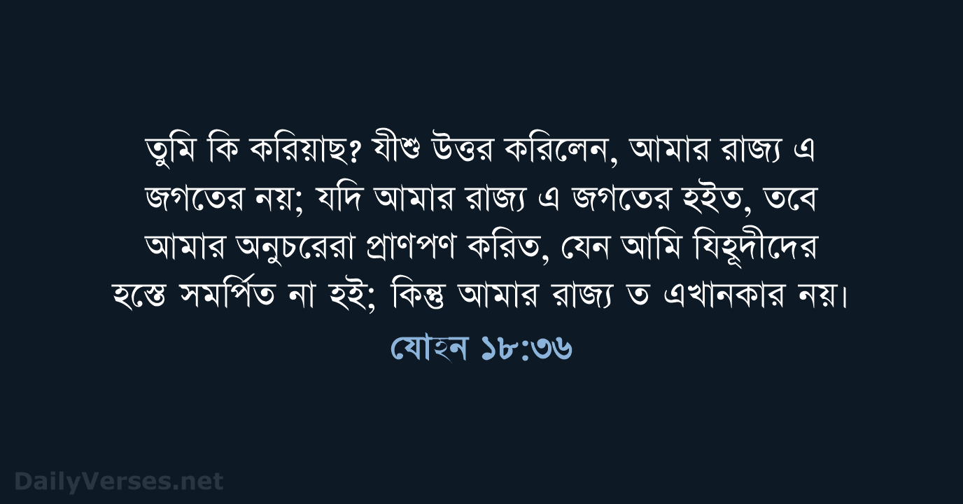 তুমি কি করিয়াছ? যীশু উত্তর করিলেন, আমার রাজ্য এ জগতের নয়; যদি আমার রাজ্য এ জগতের হইত, তবে আমার অনুচরেরা প্রাণপণ করিত, যেন আমি যিহূদীদের হস্তে সমর্পিত না হই; কিন্তু আমার রাজ্য ত এখানকার নয়।