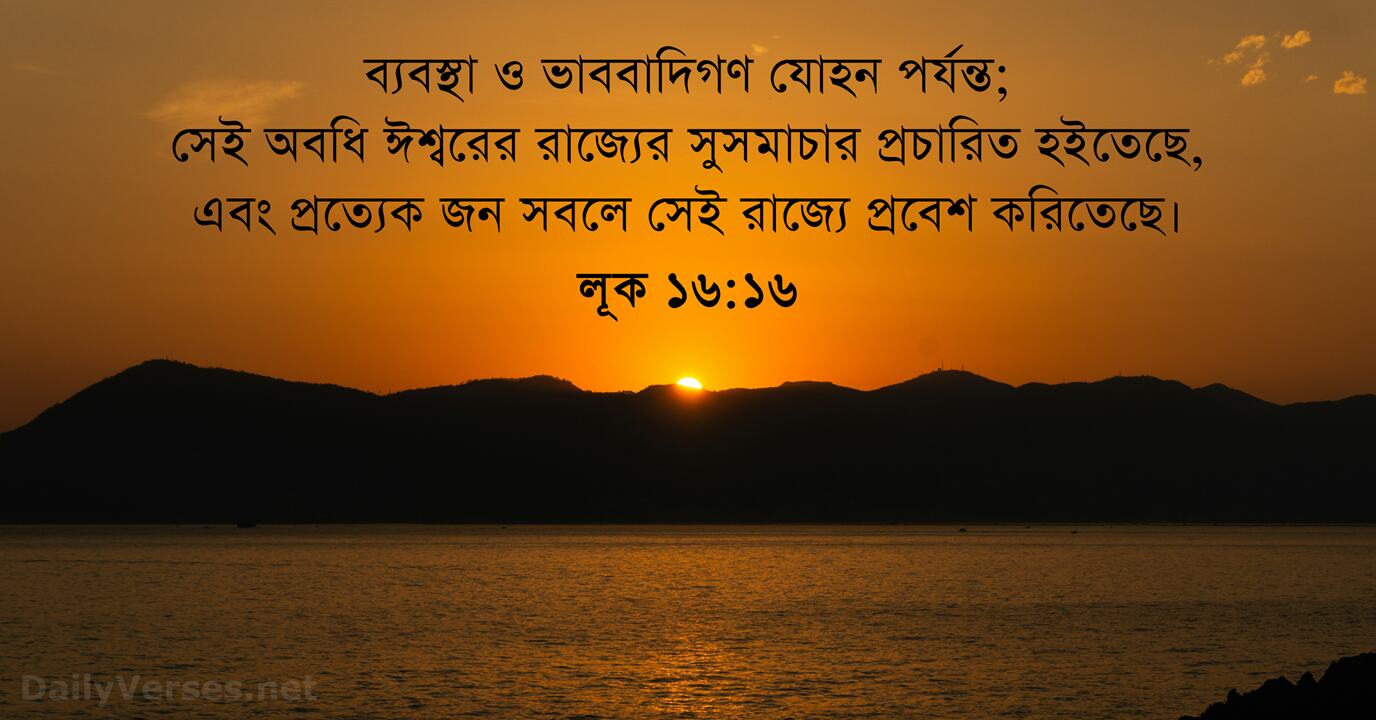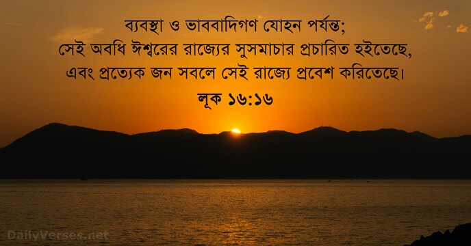 ব্যবস্থা ও ভাববাদিগণ যোহন পর্যন্ত; সেই অবধি ঈশ্বরের রাজ্যের সুসমাচার প্রচারিত হইতেছে, এবং প্রত্যেক জন সবলে সেই রাজ্যে প্রবেশ করিতেছে।