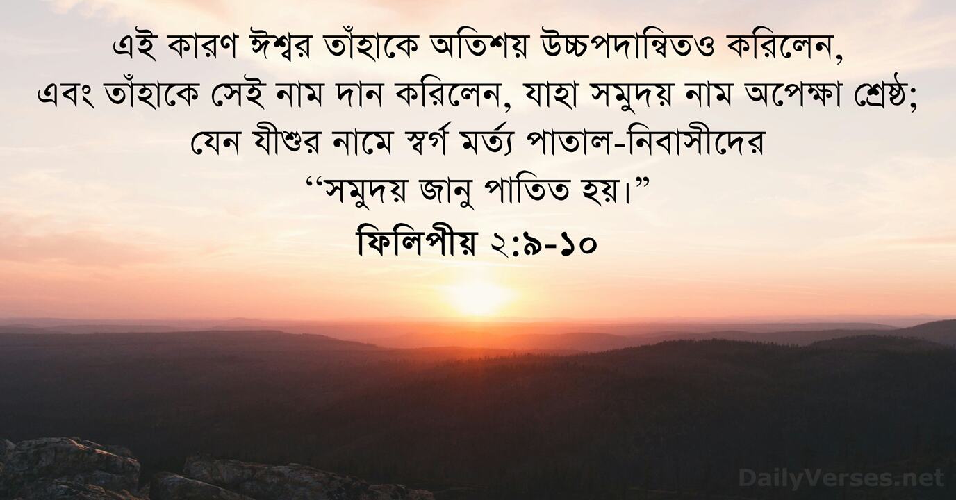 এই কারণ ঈশ্বর তাঁহাকে অতিশয় উচ্চপদান্বিতও করিলেন, এবং তাঁহাকে সেই নাম দান করিলেন, যাহা সমুদয় নাম অপেক্ষা শ্রেষ্ঠ; যেন যীশুর নামে স্বর্গ মর্ত্য পাতাল-নিবাসীদের ‘‘সমুদয় জানু পাতিত হয়।”