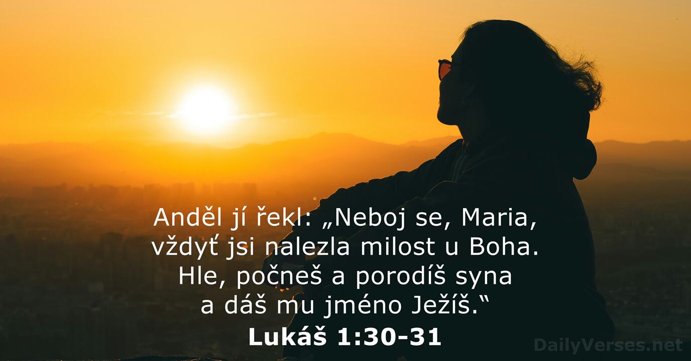 Anděl jí ale řekl: „Neboj se, Marie, vždyť jsi nalezla milost u Boha! Hle, počneš, porodíš syna a dáš mu jméno Ježíš.“