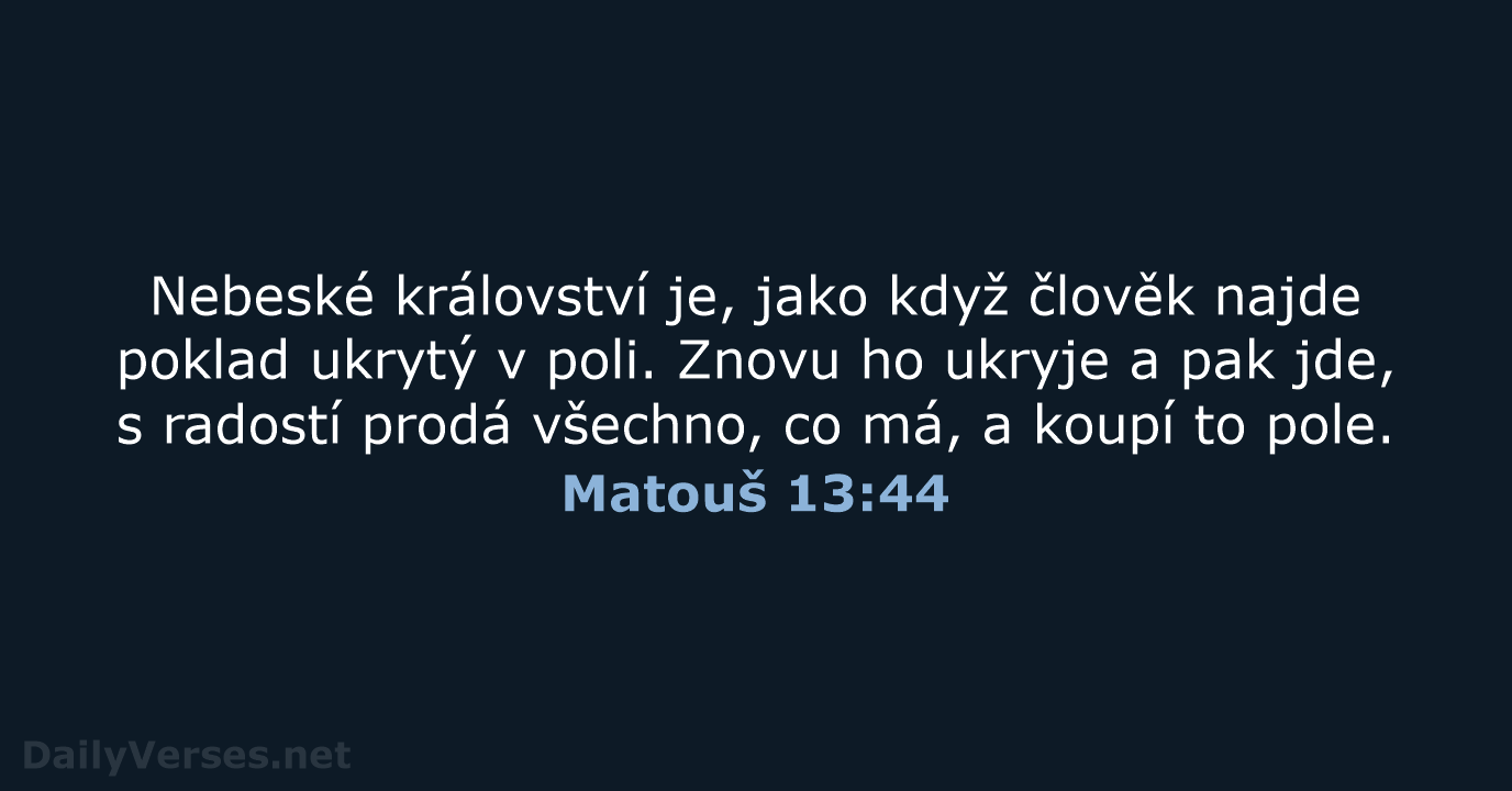 Nebeské království je, jako když člověk najde poklad ukrytý v poli. Znovu ho ukryje a pak jde, s radostí prodá všechno, co má, a koupí to pole.