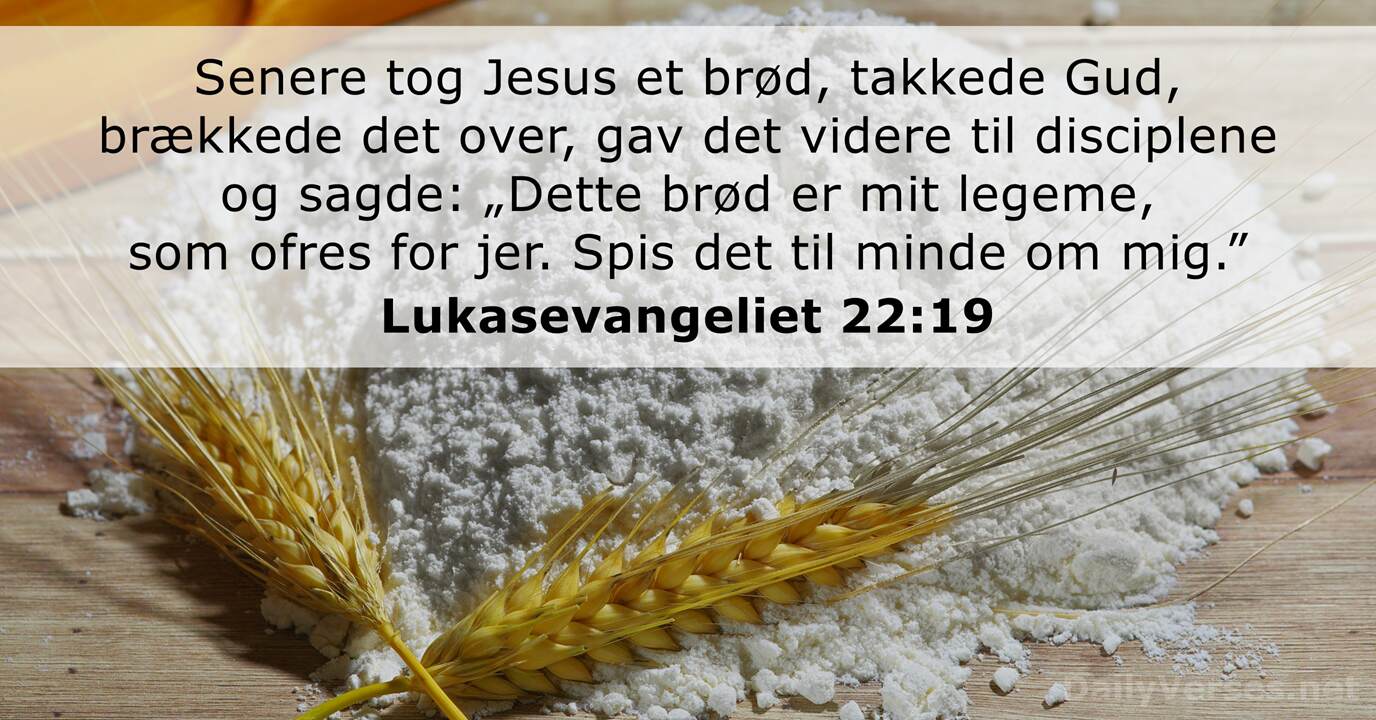 Senere tog Jesus et brød, takkede Gud, brækkede det over, gav det videre til disciplene og sagde: „Dette brød er mit legeme, som ofres for jer. Spis det til minde om mig.”