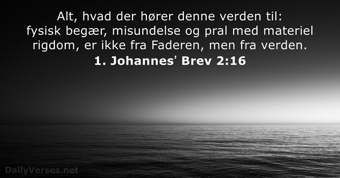 Alt, hvad der hører denne verden til: fysisk begær, misundelse og pral med materiel rigdom, er ikke fra Faderen, men fra verden.