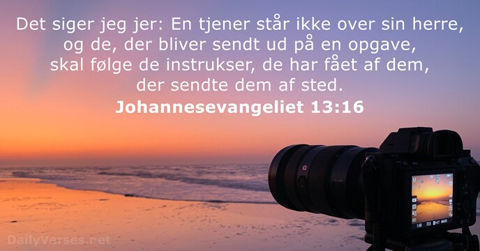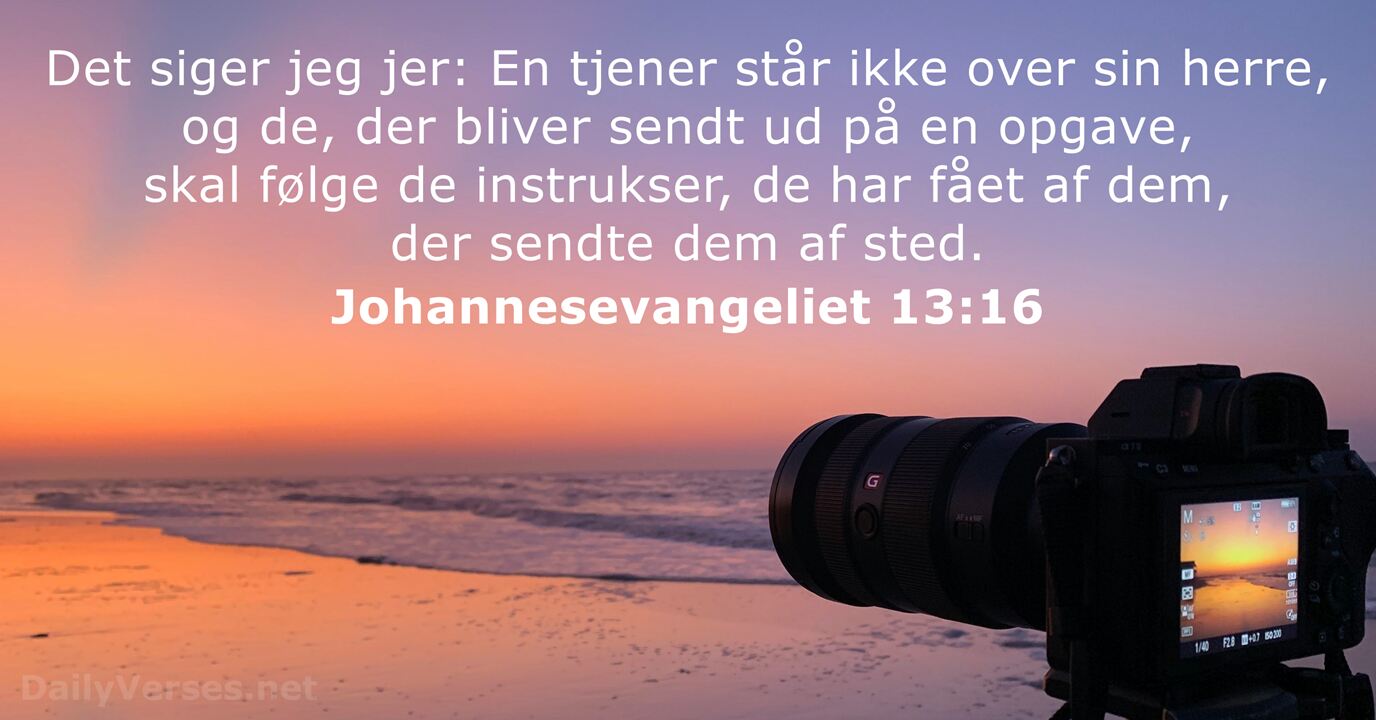 Det siger jeg jer: En tjener står ikke over sin herre, og de, der bliver sendt ud på en opgave, skal følge de instrukser, de har fået af dem, der sendte dem af sted. Sandelig, sandelig, siger jeg eder, en Tjener er ikke større end sin Herre, ikke heller et Sendebud større end den, som har sendt ham. De, der tror på ham, bliver ikke dømt. Men de, der ikke tror på ham, er allerede dømt, for de har nægtet at tro på Guds egen Søn. Men det, Helligånden frembringer i os, er: Kærlighed, glæde og fred; tålmodighed og hjælpsomhed; godhed og troskab; nænsomhed og selvbeherskelse. Ingen lov forbyder den slags ting.Næste vers!Med billede