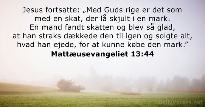 Jesus fortsatte: „Med Guds rige er det som med en skat, der lå skjult i en mark. En mand fandt skatten og blev så glad, at han straks dækkede den til igen og solgte alt, hvad han ejede, for at kunne købe den mark.”