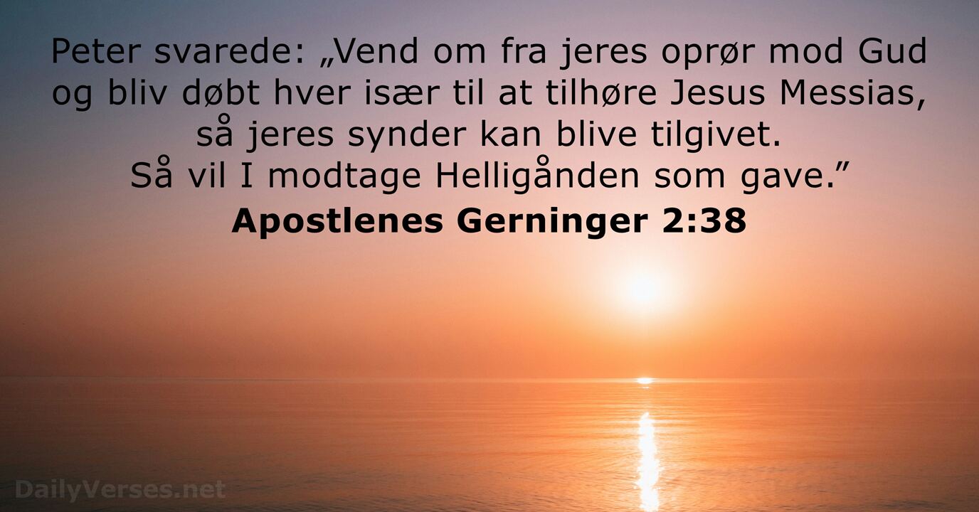 Peter svarede: „Vend om fra jeres oprør mod Gud og bliv døbt hver især til at tilhøre Jesus Messias, så jeres synder kan blive tilgivet. Så vil I modtage Helligånden som gave.”