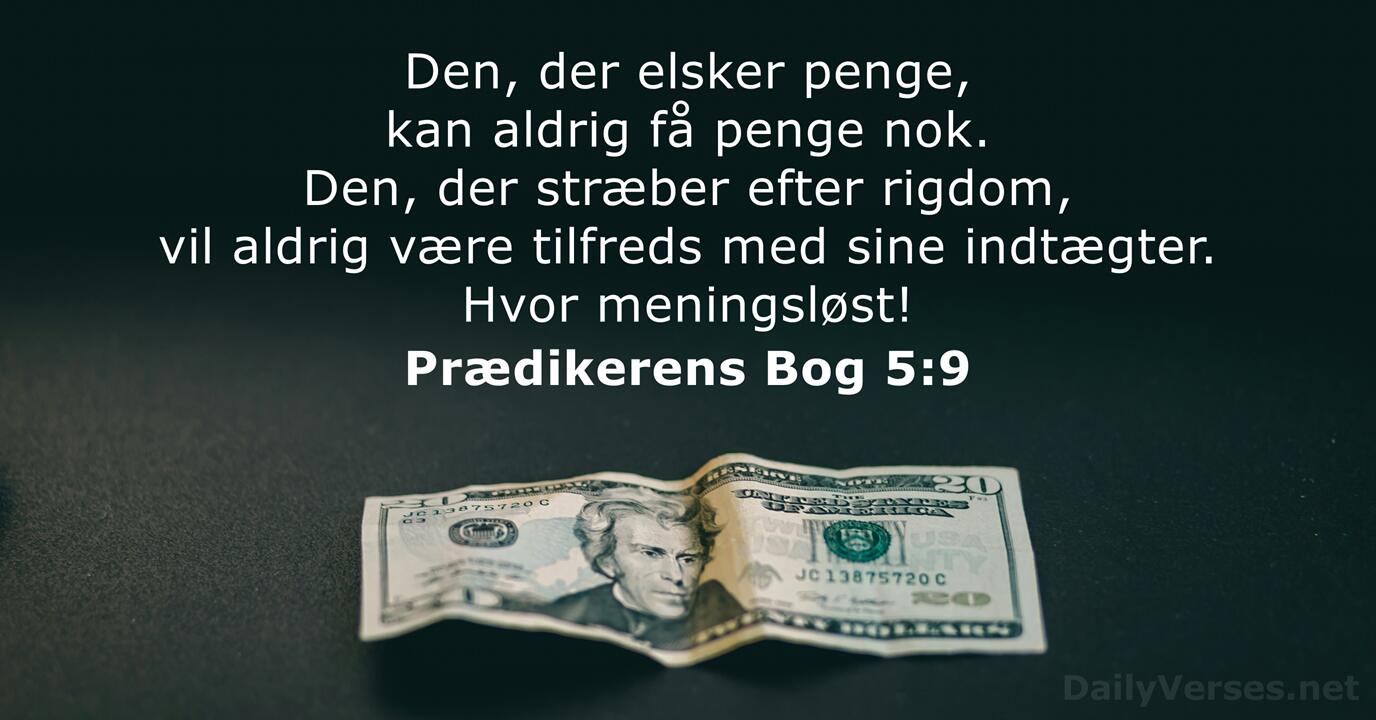 Den, der elsker penge, kan aldrig få penge nok. Den, der stræber efter rigdom, vil aldrig være tilfreds med sine indtægter. Hvor meningsløst! Hvo der elsker Penge, kan ikke mættes af Penge, og hvo som elsker meget Gods, ikke af Indtægt; ogsaa dette er Forfængelighed. Det er grunden til, at jeg siger, at I ikke skal bekymre jer for, om I nu også har mad at spise og tøj at tage på. Livet er jo mere end maden og tøjet. Gud har åbenbaret sin nåde, som gør det muligt for alle mennesker at blive frelst. Hans nåde opdrager os til at sige nej til at leve et gudløst liv fuldt af syndige lidenskaber og i stedet leve fornuftigt, retskaffent og gudfrygtigt, så længe vi er her på jorden.Næste vers!Med billede