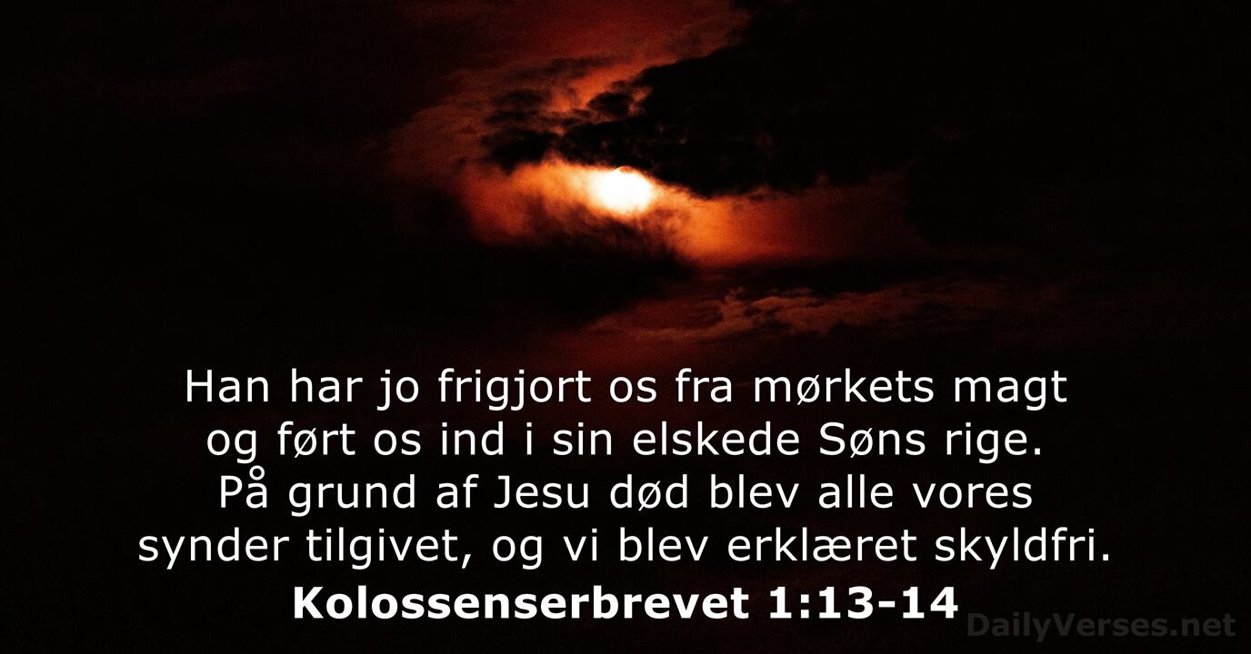 Han har jo frigjort os fra mørkets magt og ført os ind i sin elskede Søns rige. På grund af Jesu død blev alle vores synder tilgivet, og vi blev erklæret skyldfri. Han, som friede os ud af Mørkets Magt og satte os over i sin elskede Søns Rige, i hvem vi have Forløsningen, Syndernes Forladelse. Det budskab, som Jesus kom med, og som vi giver videre til jer, er, at Gud er lys. Der findes slet intet mørke i ham. Vær ikke bekymrede for noget, men sig altid Gud tak og læg jeres ønsker frem for ham i bøn. Så vil I opleve, at Guds fred, som overgår al menneskelig forstand, vil beskytte jeres tanker og hjerter og bevare jeres tillid til Jesus Kristus.Næste vers!Med billede