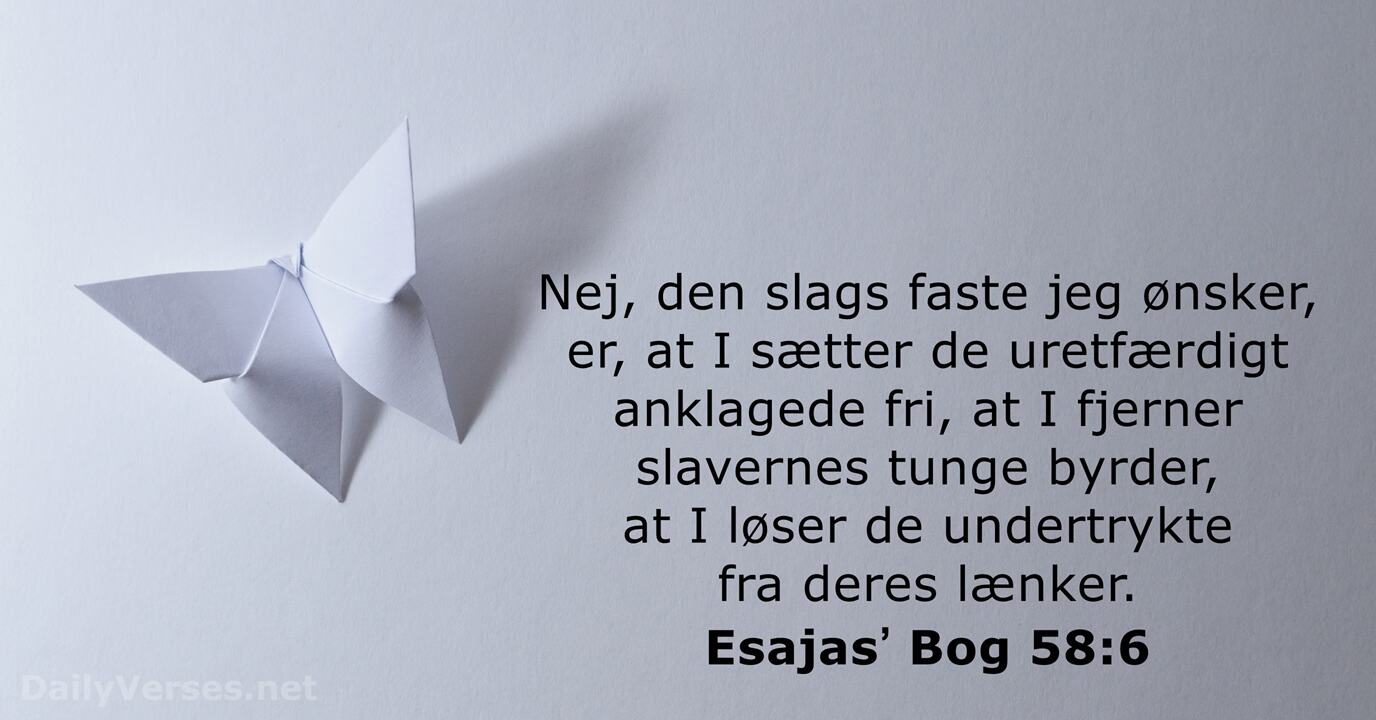 Nej, den slags faste jeg ønsker, er, at I sætter de uretfærdigt anklagede fri, at I fjerner slavernes tunge byrder, at I løser de undertrykte fra deres lænker.