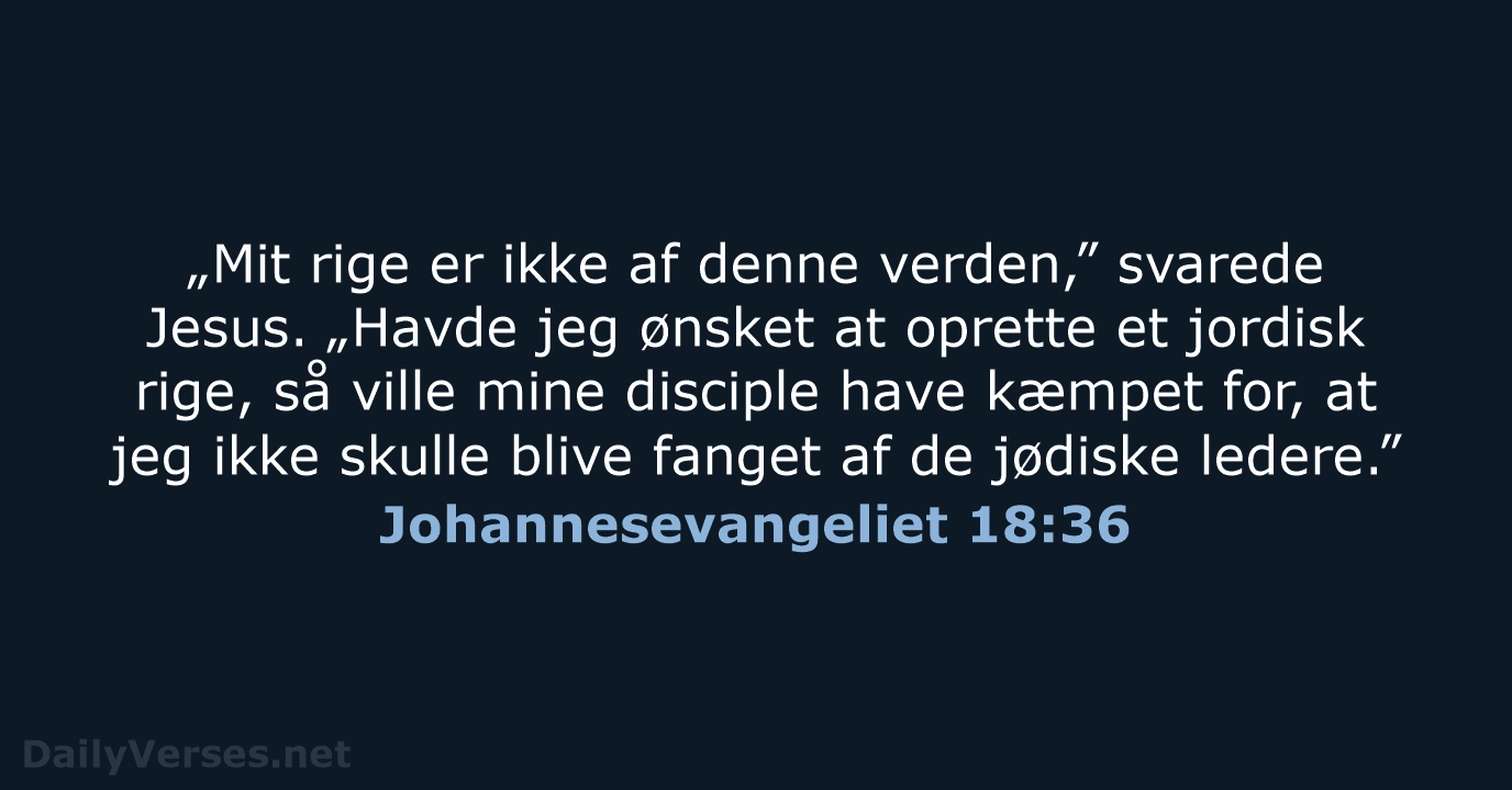 Jesus svarede: „Mit Rige er ikke af denne Verden. Var mit Rige af denne Verden, havde mine Tjenere stridt for, at jeg ikke var bleven overgiven til Jøderne; men nu er mit Rige ikke deraf.“