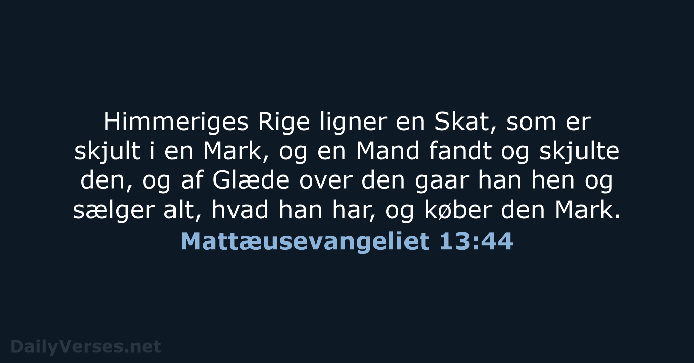 Himmeriges Rige ligner en Skat, som er skjult i en Mark, og en Mand fandt og skjulte den, og af Glæde over den gaar han hen og sælger alt, hvad han har, og køber den Mark.
