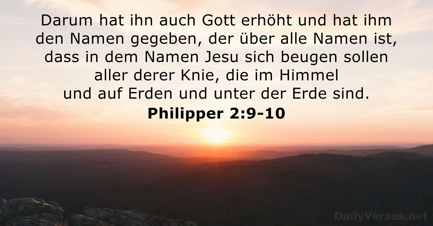 Darum hat ihn auch Gott erhöht und hat ihm einen Namen gegeben, der über alle Namen ist, daß in dem Namen Jesu sich beugen aller derer Kniee, die im Himmel und auf Erden und unter der Erde sind.