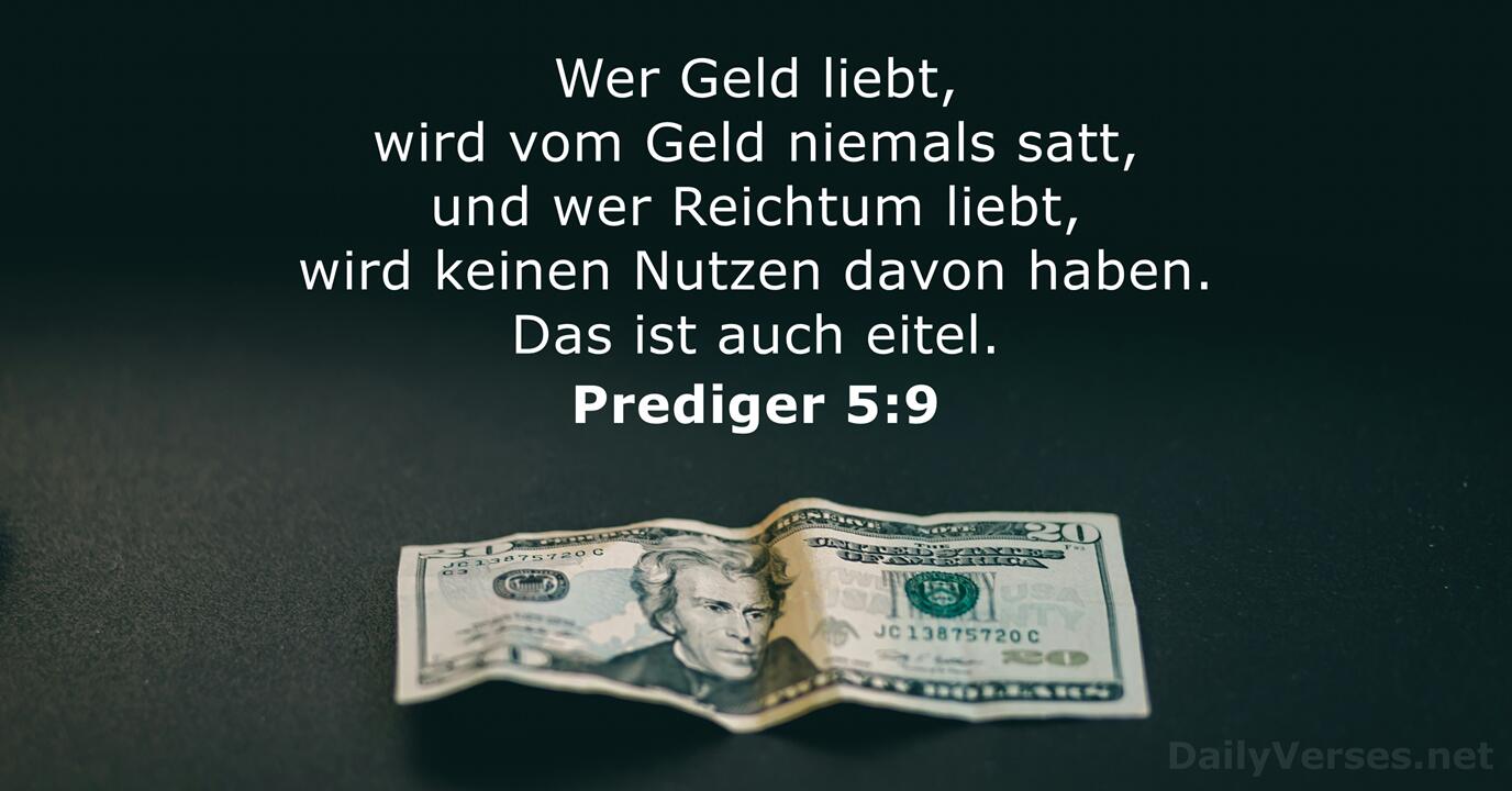 Wer Geld liebt, wird vom Geld niemals satt, und wer Reichtum liebt, wird keinen Nutzen davon haben. Das ist auch eitel.