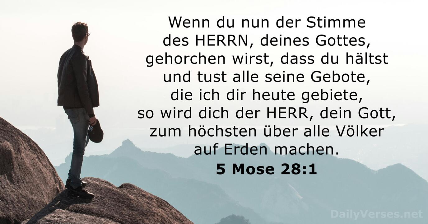 Wenn du nun der Stimme des HERRN, deines Gottes, gehorchen wirst, dass du hältst und tust alle seine Gebote, die ich dir heute gebiete, so wird dich der HERR, dein Gott, zum höchsten über alle Völker auf Erden machen.