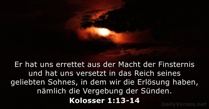 Er hat uns errettet aus der Macht der Finsternis und hat uns versetzt in das Reich seines geliebten Sohnes, in dem wir die Erlösung haben, nämlich die Vergebung der Sünden.