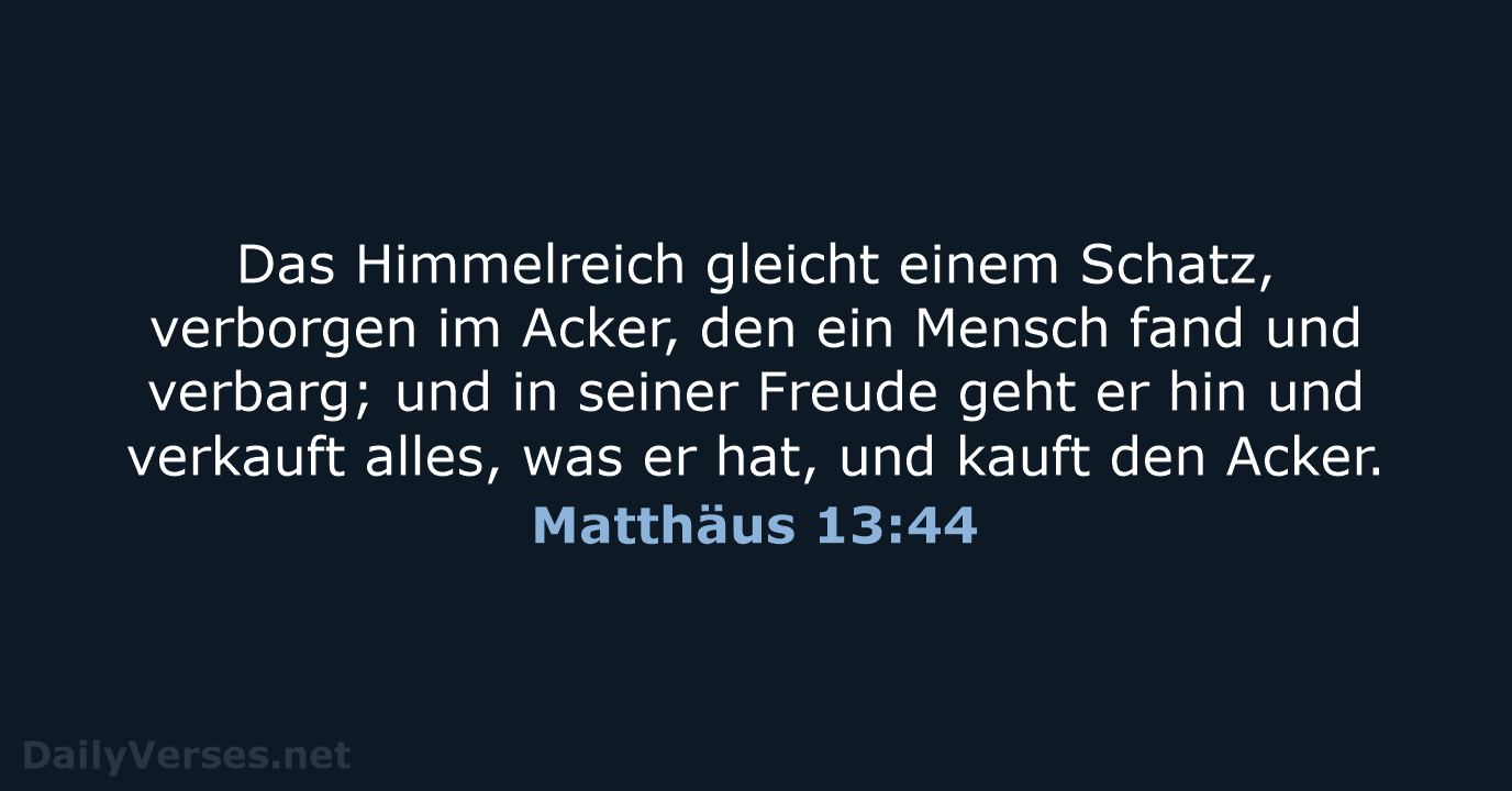 Das Reich der Himmel gleicht einem im Acker verborgenen Schatz, den ein Mensch fand und verbarg; und vor Freude darüber geht er hin und verkauft alles, was er hat, und kauft jenen Acker.