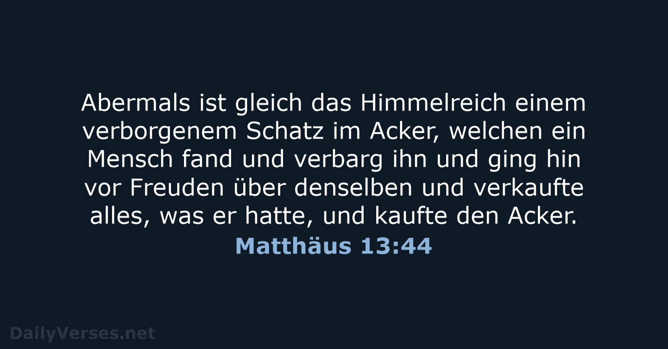 Das Reich der Himmel gleicht einem im Acker verborgenen Schatz, den ein Mensch fand und verbarg; und vor Freude darüber geht er hin und verkauft alles, was er hat, und kauft jenen Acker.