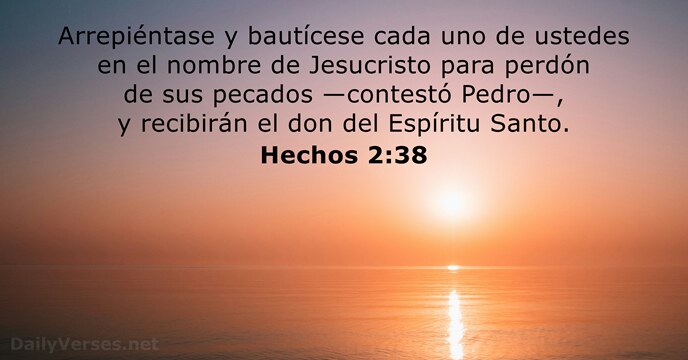 Y Pedro les dijo: Arrepentíos y sed bautizados cada uno de vosotros en el nombre de Jesucristo para perdón de vuestros pecados, y recibiréis el don del Espíritu Santo.
