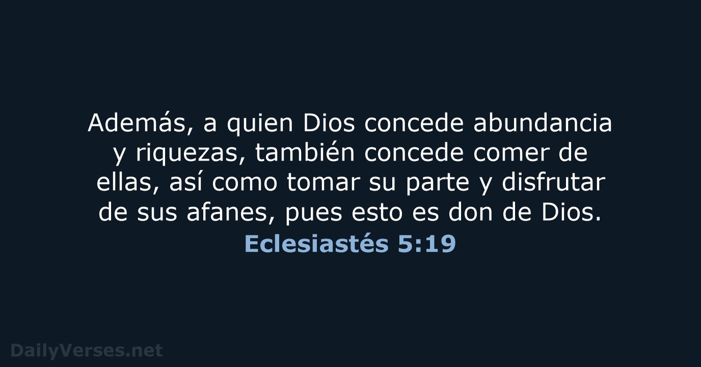 Además, a quien Dios concede abundancia y riquezas, también concede comer de ellas, así como tomar su parte y disfrutar de sus afanes, pues esto es don de Dios.