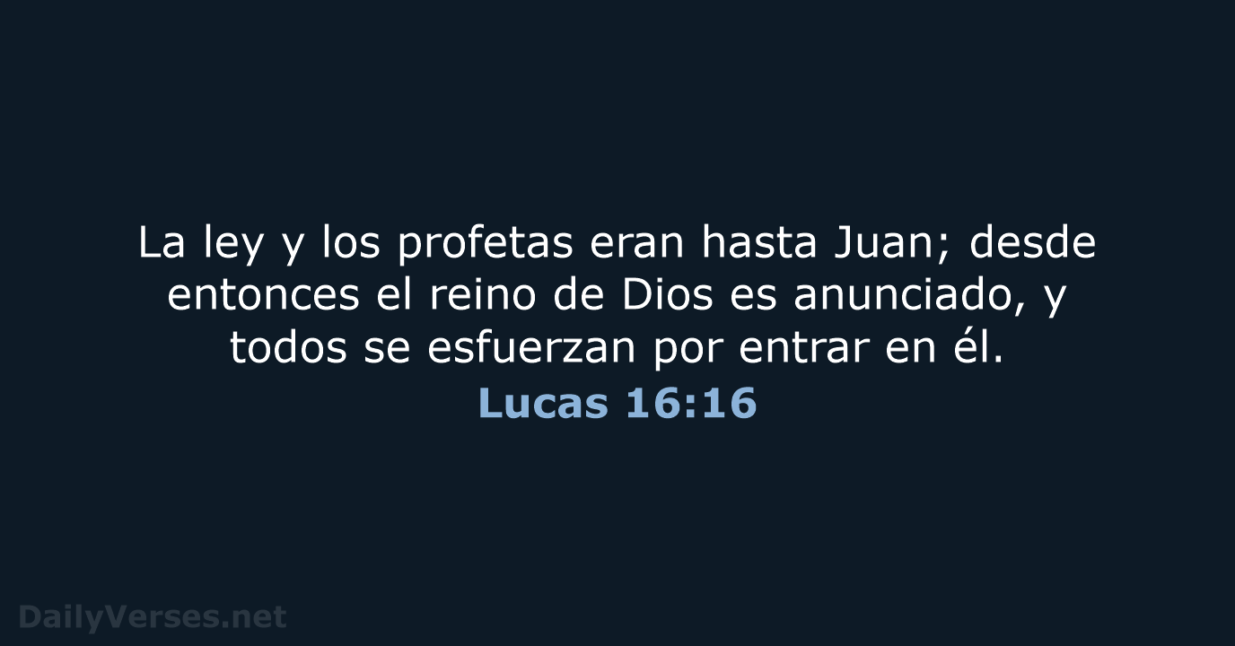 - La ley y los profetas eran hasta Juan; desde entonces el reino de Dios es anunciado, y todos se esfuerzan por entrar en él.