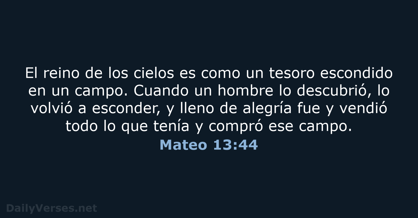 Además, el reino de los cielos es semejante a un tesoro escondido en un campo, el cual un hombre halla, y lo esconde de nuevo; y gozoso por ello va y vende todo lo que tiene, y compra aquel campo.