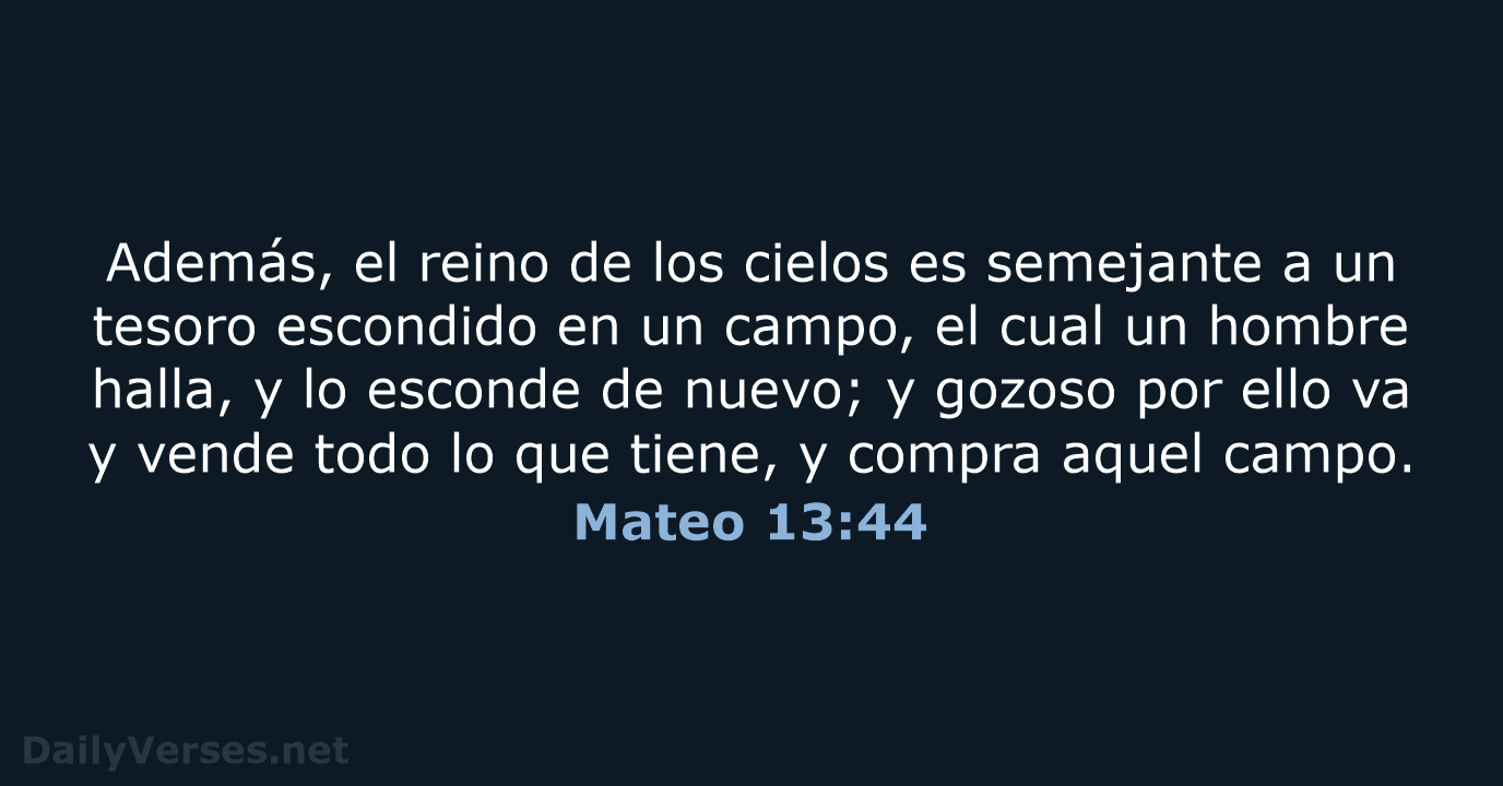 Además, el reino de los cielos es semejante a un tesoro escondido en un campo, el cual un hombre halla, y lo esconde de nuevo; y gozoso por ello va y vende todo lo que tiene, y compra aquel campo.