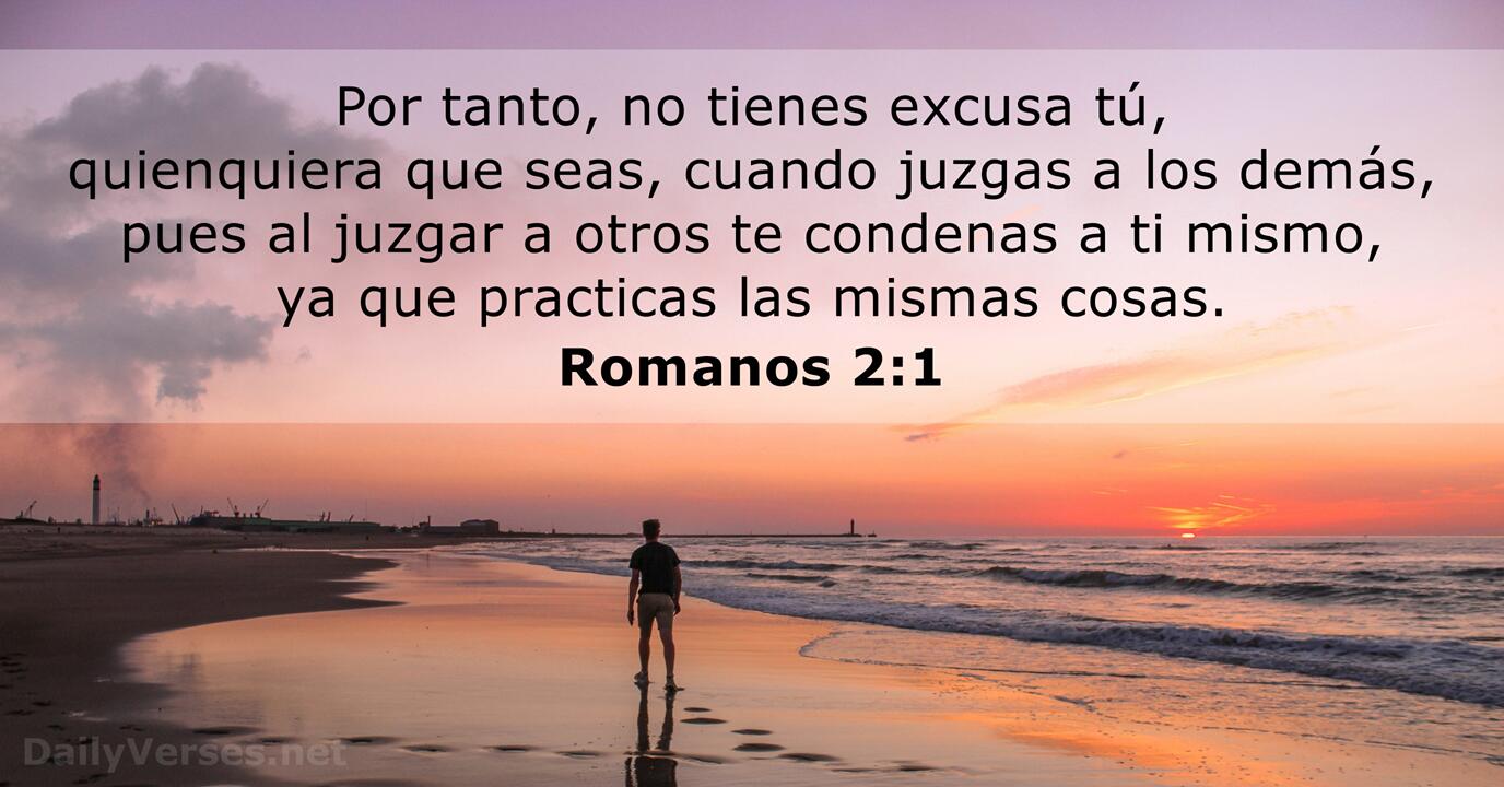 Por lo cual no tienes excusa, oh hombre, quienquiera que seas tú que juzgas, pues al juzgar a otro, a ti mismo te condenas, porque tú que juzgas practicas las mismas cosas.