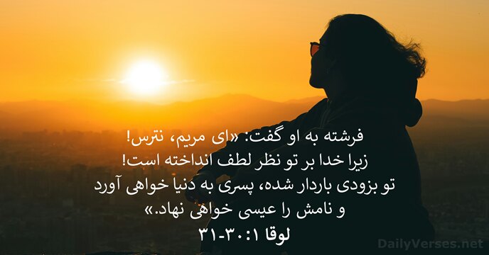 فرشته به او گفت: «ای مريم، نترس! زيرا خدا بر تو نظر لطف انداخته است! تو بزودی باردار شده، پسری به دنیا خواهی آورد و نامش را عيسی خواهی نهاد.»
