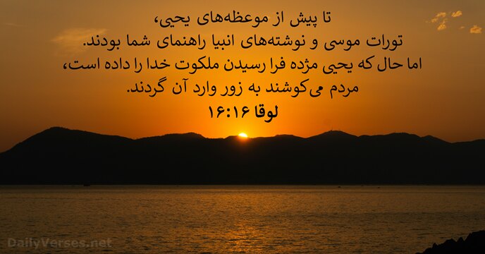 تا پيش از موعظههای يحيی، تورات موسی و نوشتههای انبیا راهنمای شما بودند. اما حال كه يحيی مژده فرا رسيدن ملكوت خدا را داده است، مردم میكوشند به زور وارد آن گردند.