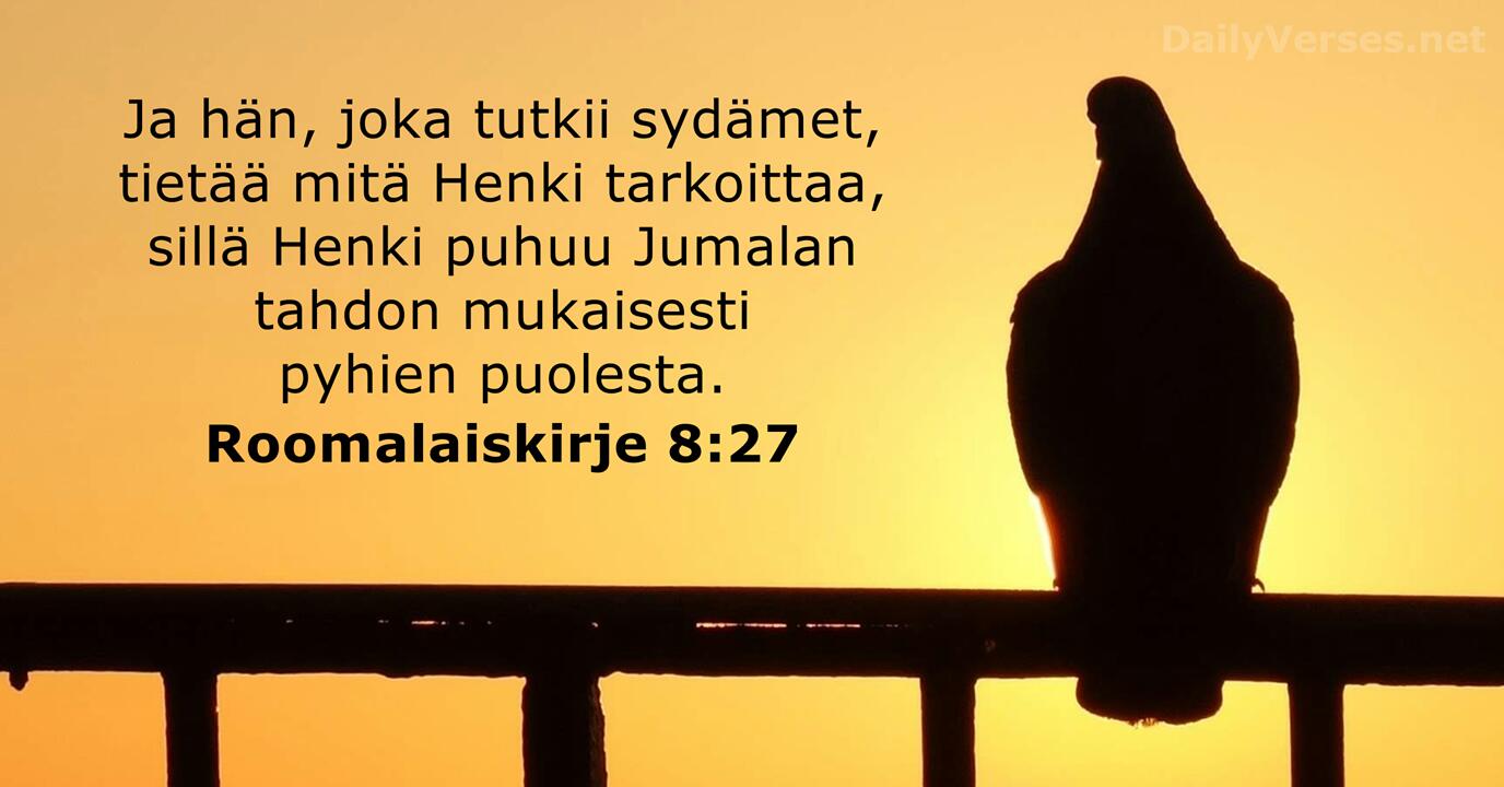 Ja hän, joka tutkii sydämet, tietää mitä Henki tarkoittaa, sillä Henki puhuu Jumalan tahdon mukaisesti pyhien puolesta.