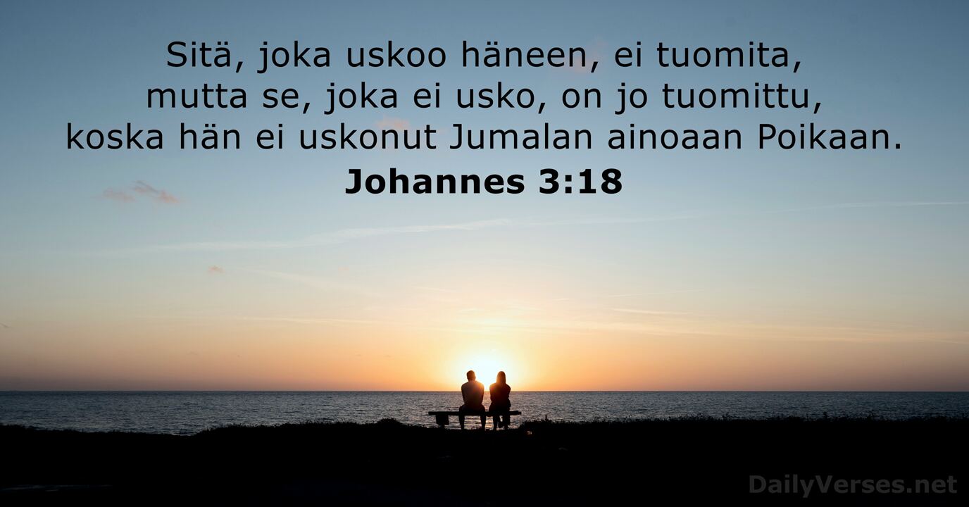 Joka uskoo häneen, sitä ei tuomita; mutta joka ei usko, se on jo tuomittu, koska hän ei ole uskonut Jumalan ainokaisen Pojan nimeen.