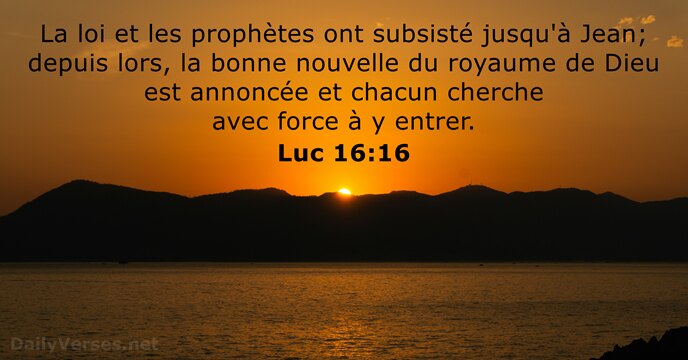 La loi et les prophètes ont subsisté jusqu'à Jean; depuis lors, la bonne nouvelle du royaume de Dieu est annoncée et chacun cherche avec force à y entrer.