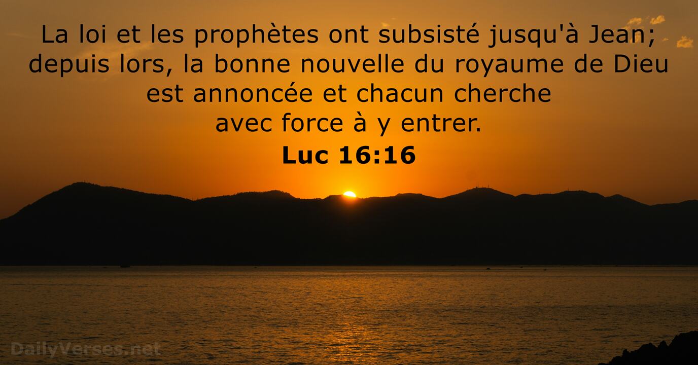 L’époque de la Loi et des prophètes va jusqu’à Jean-Baptiste ; depuis qu’il est venu, le royaume de Dieu est annoncé, et chacun use de violence pour y entrer.