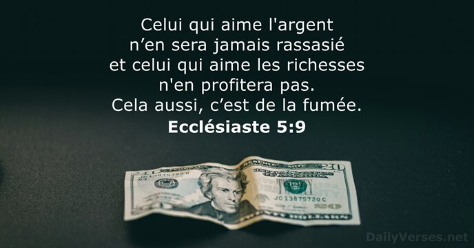 Celui qui aime l'argent n’en sera jamais rassasié et celui qui aime les richesses n'en profitera pas. Cela aussi, c’est de la fumée.